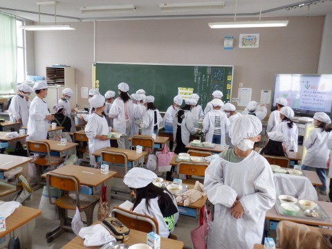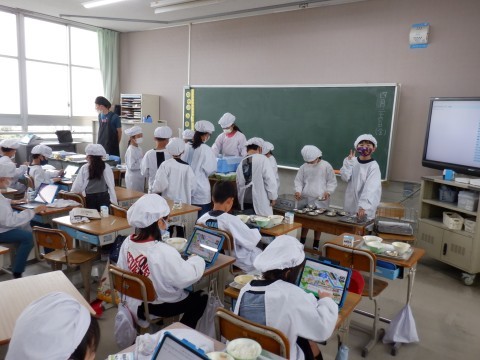 給食係さんが手際よく準備を進めてくれています。できあがった班から給食を運びます。それまでは静かに待っています。準備が終わるまでもうすぐです。楽しい給食の時間にしましょう。