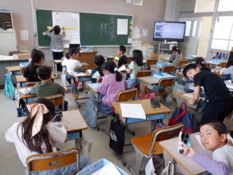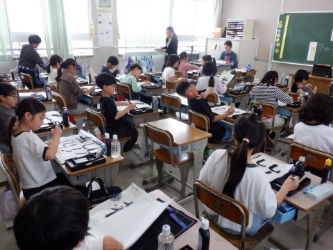 書写、算数の授業です。書写の授業は毛筆に取り組んでいます。「花」という字を書いています。その前にはらいやはねなど基礎的な部分を練習してから書いています。頑張れ!
