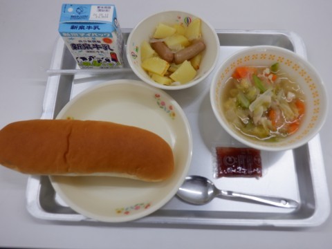 ウインナーポテト、春野菜スープ、コッペパン、イチゴジャム、牛乳です。今日は西洋風のランチというイメージです。コッペパンにイチゴジャムをつけて甘くして食べるのを喜んでいました。