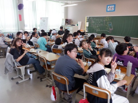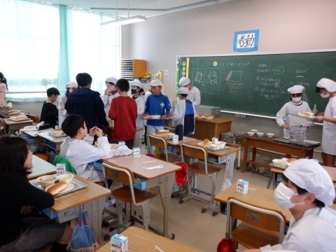 給食係のみなさんが何も言わずに準備を進めています。みんなが何をすれば良いかよくわかっているようです。