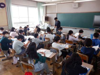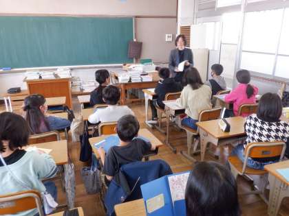 新しい担任の先生から、本日の配布プリントを配ってもらっています。