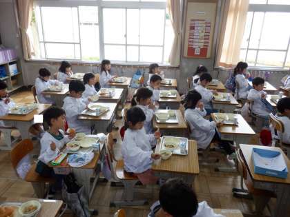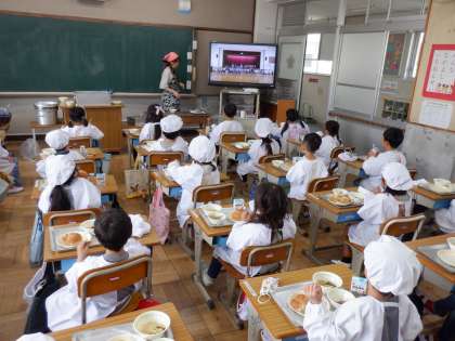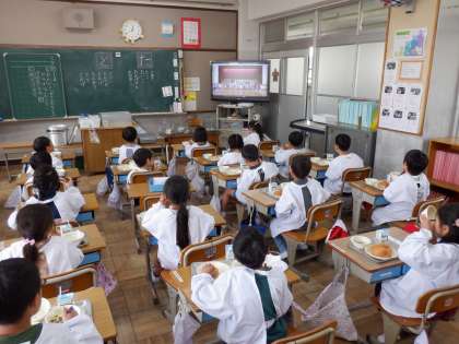 あらかじめ撮影した映像を給食の時間に視聴しています。