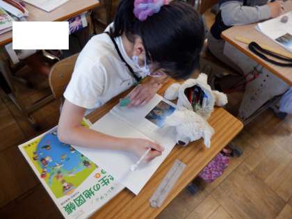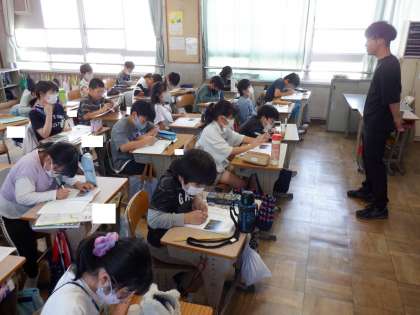 社会の授業の様子です。資料を見て気づいたことを書きだしていました。先生が設定した時間では足りないようで、気づいたことをもっともっと書き出したいと先生にお願いしていました。学習に積極的に取り組む姿勢が感じられます。