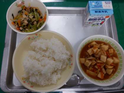 今日の献立は、ごはん、牛乳、マーボー丼、小松菜の炒め煮 です。