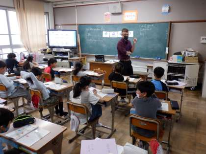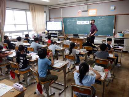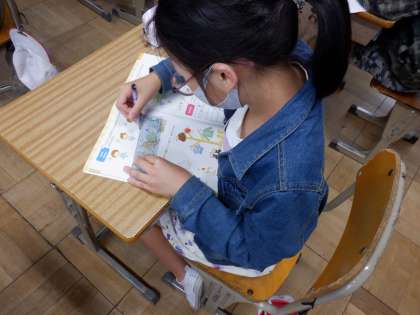 外国語活動の授業の様子です。今日はNSの先生に来ていただきました。天気の尋ね方と答え方を練習しました。