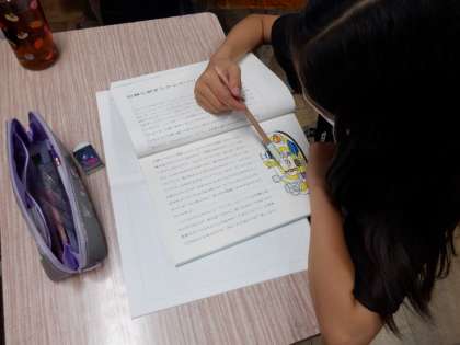国語の授業の様子です。先生の音読を聞いて段落分けをしています。鉛筆を片手に内容を読み取りながら段落分けをしました。