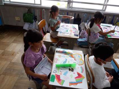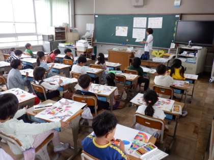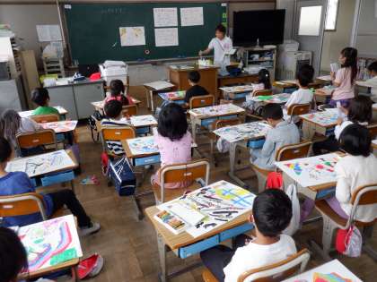 図工の授業の様子です。初めて水彩絵の具を使います。パレットやバケツの使い方などを確認していました。先生の説明をしっかり聞いています。