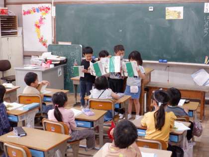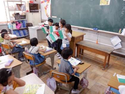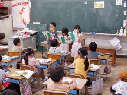 国語の授業の様子です。教科書の挿絵を見て登場人物のセリフを想像しました。みんなの前で考えたセリフを披露しました。しっかりと発表できてすごい!!
