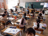 書写の授業に様子です。専科担当の先生に鉛筆の持ち方や書く時の姿勢を教えてもらいました。また、鉛筆で「まがり」の書き方を練習しました。