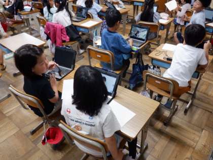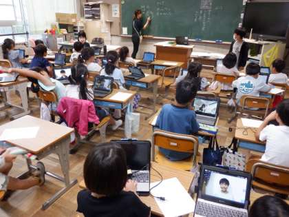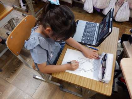 タブレット端末で撮影してきたおうちの人を画用紙に描いています。