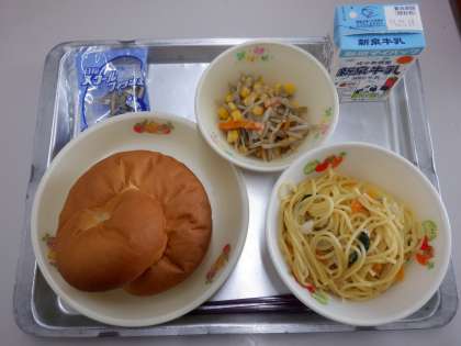 今日の献立は、ソフトパン、牛乳、ぺペロンチーノ、ごぼうサラダ、ミニフィッシュ です。