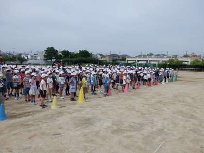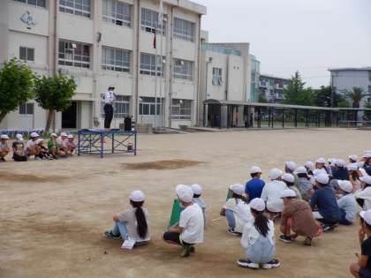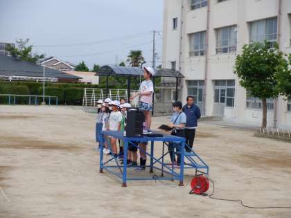 先週とは異なりよい天気のなか、運動場で児童朝会を行いました。