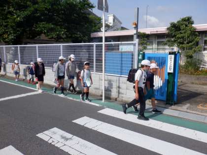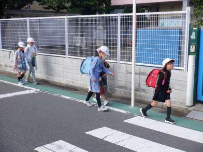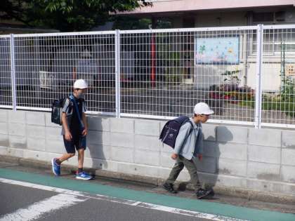 グリーンベルトを歩いて登校しています。