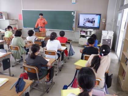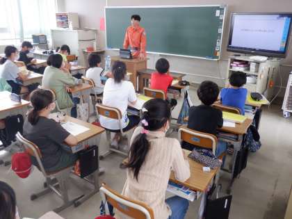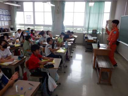 総合的な学習の時間の授業の様子です。今日は堺市消防局に勤務する現役消防士さんに来ていただき、消防士の仕事についてお話しいただきました。苦労やつらいと思ったことをお話ししていただく中で、目の前の命を救うことができなかった経験を話され、子どもたちは神妙な表情で聞き入っていました。