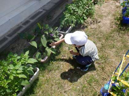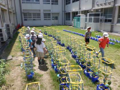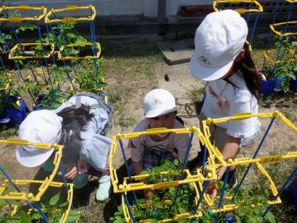 2年生が生活科で育てている野菜にお水をあげていました。小さなトマトやなすびができていて、うれしそうな表情で見せてくれました。