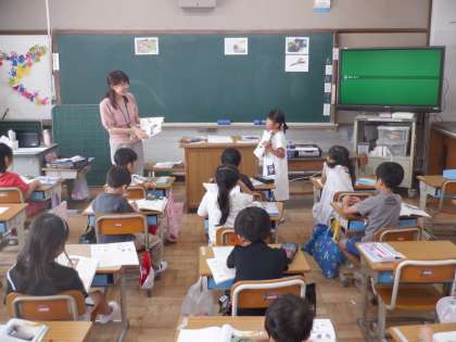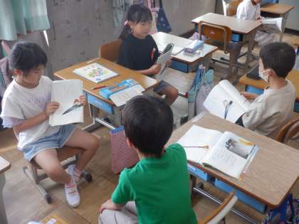 国語の授業の様子です。説明的文章「くちばし」では、それぞれの鳥のくちばしの説明の仕方が同じ書き方で表されています。今日はペアで文章の書き出しの部分をクイズにして出し合いました。