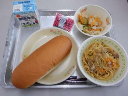 今日の献立は、ツナサラダとドレッシング、じゃこと小松菜のスパゲティ、コッペパン、大豆クリーム、牛乳です。今日の大おかずのちりめんじゃこは「イワシ」の稚魚を塩ゆでした後、天日干しにした食品です。骨ごと食べることができるので、しっかりとカルシウムをとることができます。
