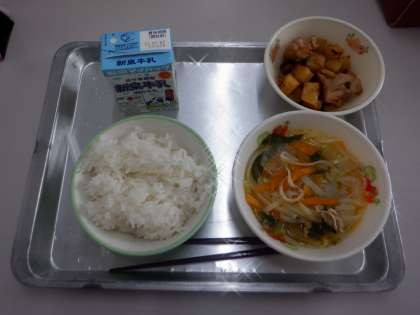 今日の献立は、ごはん、牛乳、フォー、ガイヤーンポテト です。