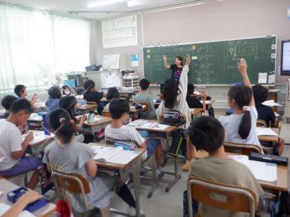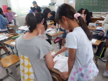 今日の1時間目は算数の授業です。小さい数の表し方を考えました。問題を解きおわった児童が小さな先生となり、問題を解いている児童にアドバイスをしていました。「なるほど、わかった。」との声が聞こえてきました。