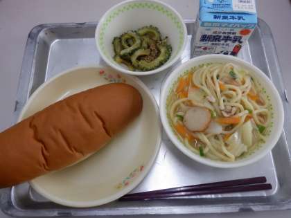 今日の献立は、黒糖パン、牛乳、沖縄風そば、ゴーヤチップス です。