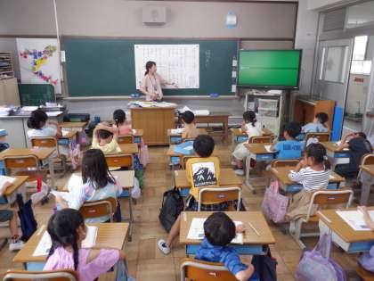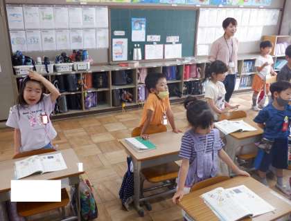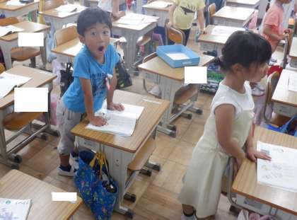 国語の授業の様子です。「あさがお、いすとり、あいうえお」と言葉遊びの詩を元気に読んでいました。大きな口を開けてしっかり読むことができました。