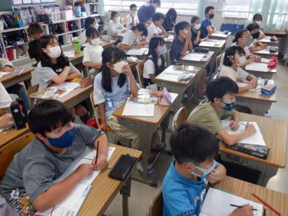 社会の授業の様子です。聖徳太子が役人の心得をしるした「十七条の憲法」や、序列を明らかにする「冠位十二階」について定めた理由を考えました。