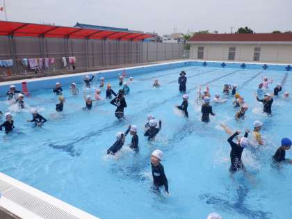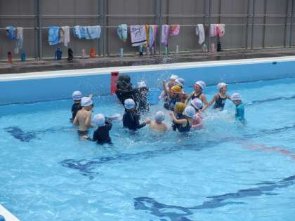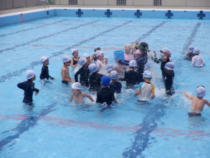 プール学習の様子です。先生の持っているバケツにチームに分かれて水を入れています。バケツの中の水の量で勝敗が決します。さて、どっちが勝ったのでしょう。