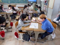 国語の授業でデジタル教科書を使って、物語の音読を聞いていました。大きな音で突然お話が始まったので先生も子どもたちもびっくり。先生が慌てて音声を小さくすると、その様子を見て子どもたちはニヤニヤとしています。先生と子どもたちの親密な関係性が垣間見えました。