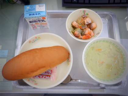 今日の献立は、コッペパン、牛乳、グリーンポタージュ、サーモンの香草焼き、メープルシロップ です。