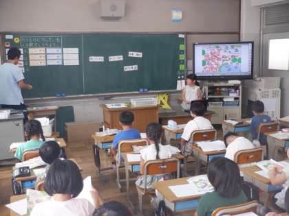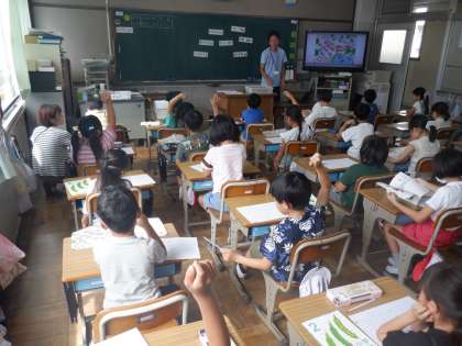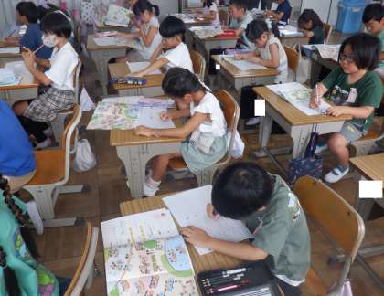 算数の授業の様子です。かけ算の学習に入るために数のまとまりに注目しようとしていました。教科書の挿絵にある乗り物に乗っている人数を調べ、同じ数ずつの集まりをもとに数え方を考えています。