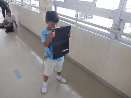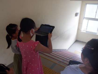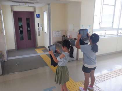 図工の時間の様子です。白鷺小学校の校舎などを描くために、校舎内を回って描くものをタブレット端末で記録していました。奥行きや影などを意識して描くことができそうです。