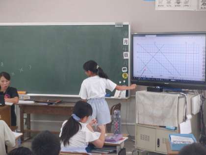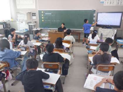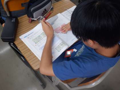 算数の授業の様子です。図形の学習をしています。教科書の問題を三角定規や分度器を使いながら解いていました。平行は見つかりましたか?