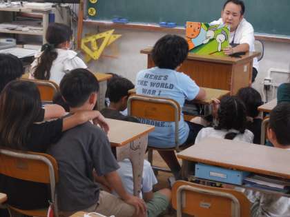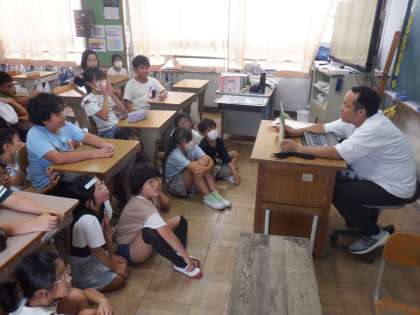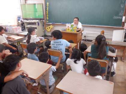 学級担任の先生が子どもたちに紙芝居の読み聞かせをしました。登場人物によって声色を変えて上手に読むと、子どもたちもこの表情で真剣に聞いていました。
