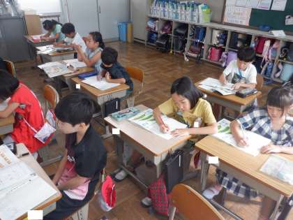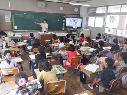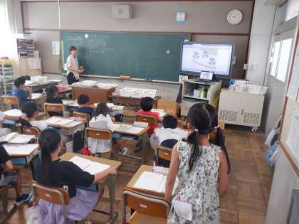 算数の授業の様子です。同じ数のまとまりがいくらかあり、ぜんぶでいくつあるか式をつかって考えました。かけ算につながっていく大切な学習です。丁寧に指導していました。