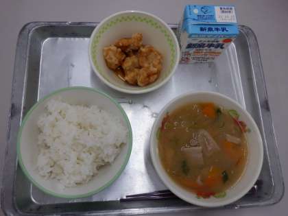 今日の献立は、ごはん、牛乳、豚汁、チキン南蛮 です。