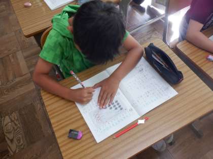 算数の授業の様子です。かけ算の学習をしています。今日は四の段を学びました。かけ算の考え方がちゃんと頭に入っているようですらすらと問題を解いていました。