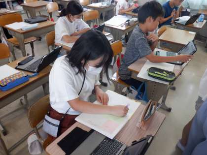 国語の授業の様子です。自分の座右の銘とする言葉を考えていました。座右の銘となる言葉を選び、その意味や選んだ理由をノートにまとめています。それができたら作文を書くそうです。今日はその文章の構成を考えていました。