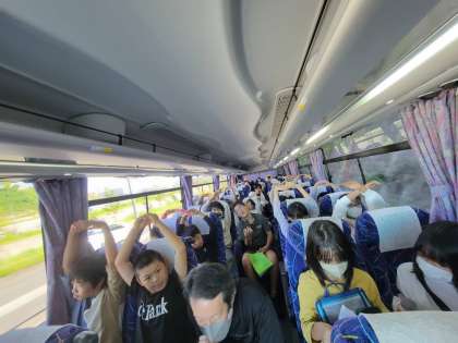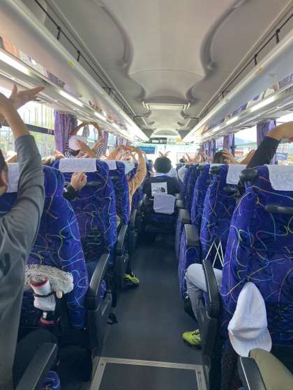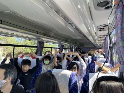 バスレクで楽しんでます。今は、マル、バツクイズです。みんなとってもいい笑顔です。