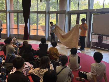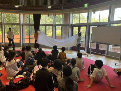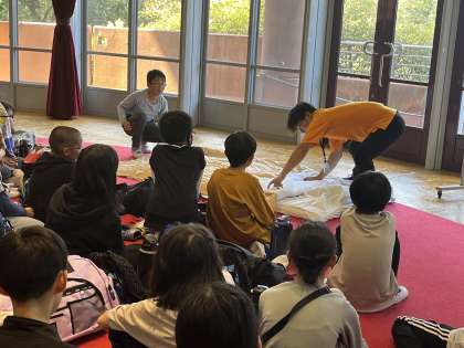 オリエンテーションでは、シーツ敷き方や布団のたたみ方の説明を聞いています。明日の朝、しっかりたたみましょうね。