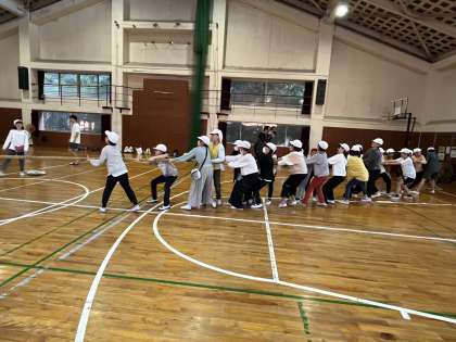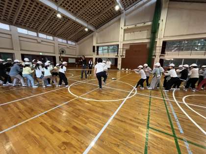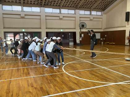 レクリエーションです。クラス対抗で綱引きをしています。みんなで力を合わせて、力いっぱい引っ張ってます。