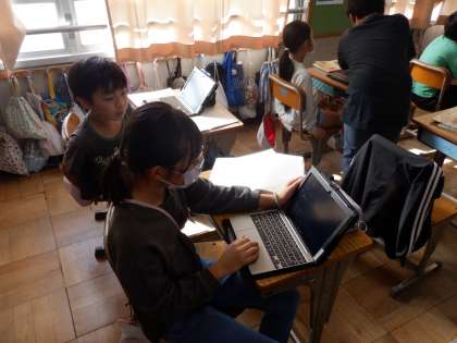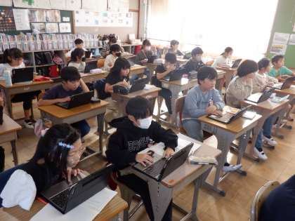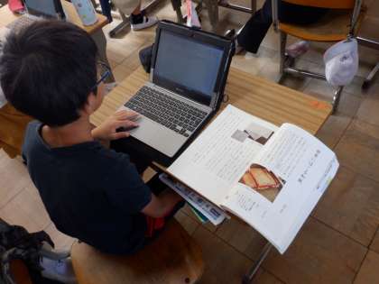 国語の授業の様子です。「世界にほこる和紙」について、タブレット端末を使って要約をしようとしていました。内容をしっかりとらえてまとめています。