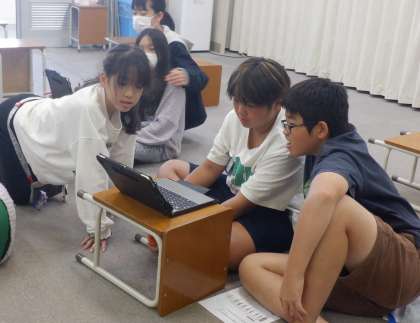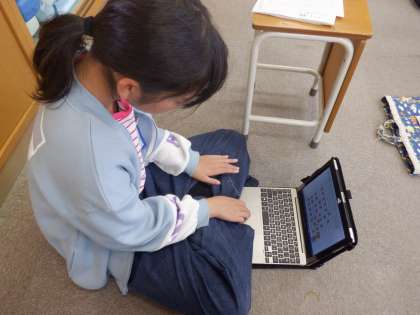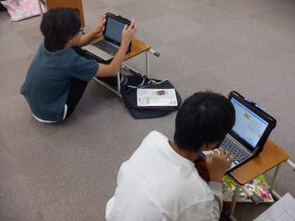 音楽の授業の様子です。タブレット端末をつかってリズムを決め、楽器音の音階を並べてオリジナル曲をプログラムしました。個性があふれるオリジナル曲ができました。
