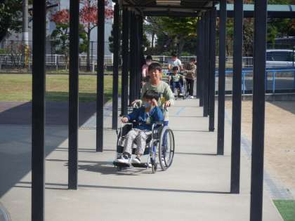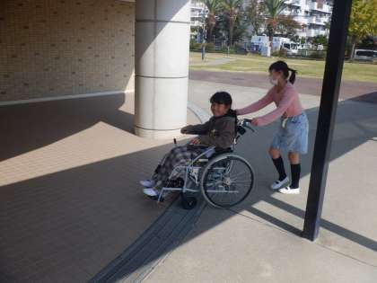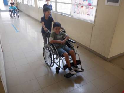 総合的な学習の時間では、障がい者理解教育、福祉教育の一環として車いす体験を行っています。車いすに乗るだけではなく,車いすを押すという体験もしています。小さな段差でも乗り越えるのが大変だったと押している子が感想を言いました。体験を通して様々なことを学ぶことができました。
