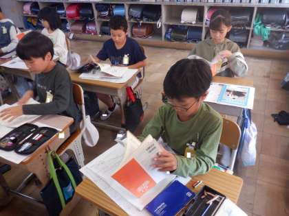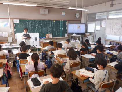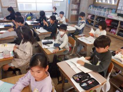 国語の授業の様子です。文章全体や段落、言葉や写真などから、筆者の説明の工夫を考えました。工夫されていることをお手本に食べ物の秘密ブックを作成する予定です。