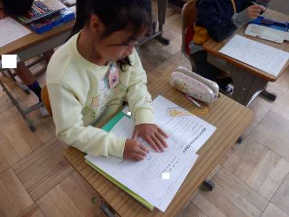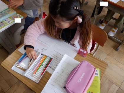 生活科の授業の様子です。おもちゃランドの振り返りをしました。絵や言葉をつかっておもちゃランドの感想を表しています。