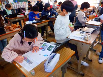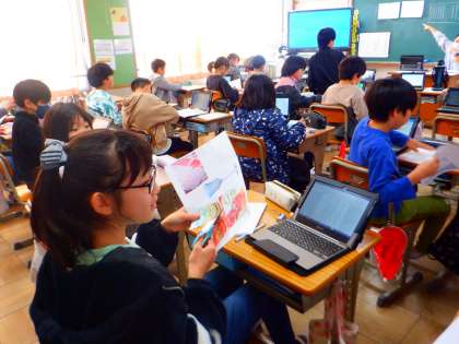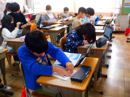 国語の授業の様子です。今日は、伝統工業について調べたことをリーフレットにまとめています。堺の刃物や西陣織、扇子などそれぞれが興味をもって調べたことを、「はじめ」「中」「終わり」にまとめていました。