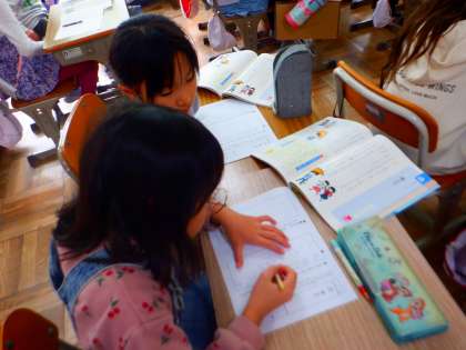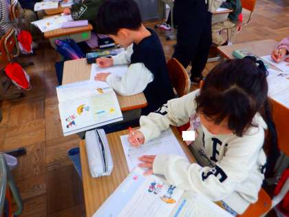 道徳の授業の様子です。今日は、「雨ふり」のお話を読んでだれにたいしても同じように接することについて考えています。登場人物の気持ちをまとめています。その後、ペアで交流しました。