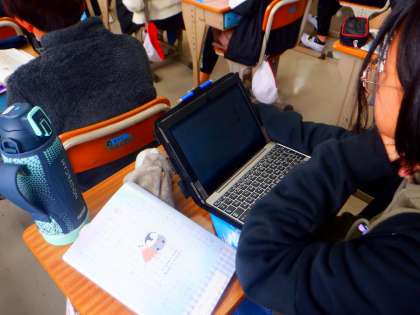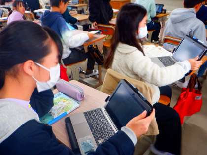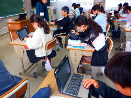 国語の授業の様子です。今日は、日本文化について調べたことをパンフレットにまとめています。文章構成や割り付け等に表現の工夫をしながら書いています。