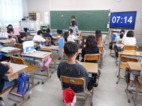 国語の授業の様子です。慣用句の意味や使い方について学習しています。班ごとに慣用句があらわす意味や使い方をクイズ形式で紹介し、その慣用句を当てようとタブレット端末を使って答えていました。