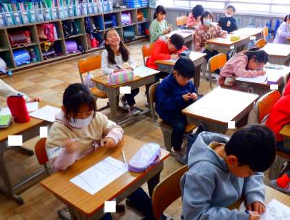 学校生活で楽しかったことを絵にしていました。かけ算の学習やなわとびなどが描かれていました。